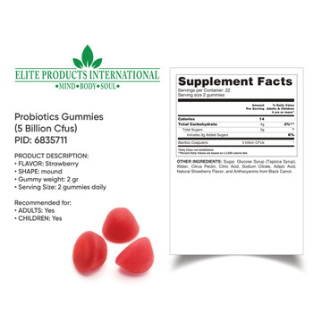 Wish list Quick view $3.00 OFF Probiotic Gummies (5 billion CFU) $26.99 $23.99 Experience the power of Elite Products International Probiotic gummy vitamins, crafted to revitalize your well-being. These strawberry-flavored gummies are infused with 5 billion CFU of Bacillus... + Add to Cart