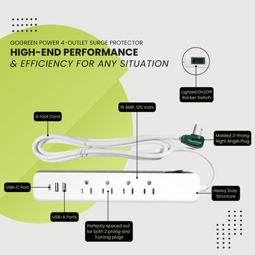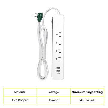 Power up your world with the Go Green Power Surge Protector! This isn't your average power strip, it's got 4 outlets, 2 USB-A ports, and a USB-C port for ultimate charging flexibility. Enjoy peace of mind knowing your gear is safe with 450 joules...