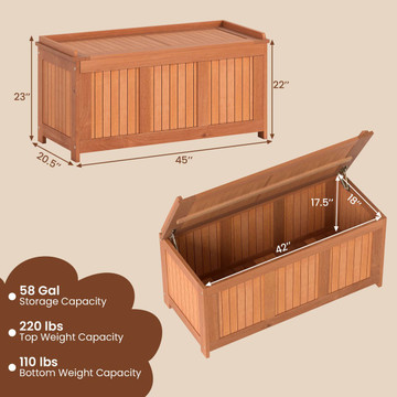 Wish list Quick view $95.00 OFF 58-Gallon Wood Deck Box with Flip Top Lid $239.99 $144.99 Reclaim your space with the 58-Gallon Wood Deck Box! Finally, a stylish storage solution that works as hard as you do, crafted from solid wood with a rich teak oil finish. This workhorse boasts a... + Add to Cart