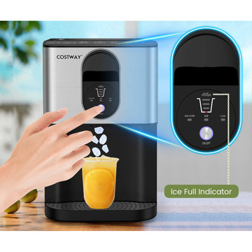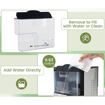 Elevate your cooling experience with our 2-in-1 Stainless Steel Countertop Ice Maker with Water Dispenser. This versatile appliance is compatible with 2-5 gallons of bottled water, ensuring a continuous supply for your convenience. With a rapid 6-12 minute ice-making cycle, it produces a generous 40 lbs. of fresh ice daily, stored in a detachable 5-pound ice storage basket. The simple button panel allows for easy ice size selection, while water-shortage and ice-full indicators promote energy efficiency. Featuring a premium compressor, this countertop marvel is a sleek and efficient addition to any space. Upgrade your chilling game with this high-performance stainless steel appliance.