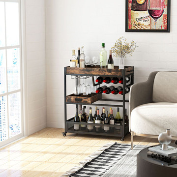 Elevate your home bar with the Goplus 3-Tier Bar Cart! This rolling cart features glass racks for up to 8 wine glasses and bottle holders for 9 bottles, ensuring your favorite vintages are always within reach. With a spacious tabletop, 2 open compartments, 8 side hooks, and 2 bottom boxes, you'll have ample storage for all your essentials. The heavy-duty metal frame provides stability, while the versatile push handle doubles as a towel rack. Its rustic and elegant design adds a timeless charm to any room, making it the perfect addition to your home bar, kitchen, or dining area.