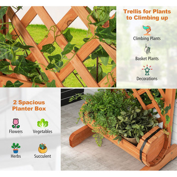 Transform your garden with the 50-Inch Wood Planter Box with Trellis Mobile Raised Bed for Climbing Plants. This versatile planter box features a built-in trellis, providing a sturdy support system for your climbing plants to flourish. Crafted with firm nail connections, it ensures durability and stability. The 6.5'' depth offers ample space for root growth, while the drainage hole at the bottom prevents waterlogging. With lockable and universal wheels, you can easily move your planter box to maximize sunlight exposure. Suitable for both indoor and outdoor use, it adds an artistic charm to any space. Upgrade your gardening experience with the 50-Inch Wood Planter Box with Trellis Mobile Raised Bed and enjoy the beauty of climbing plants in your own backyard.