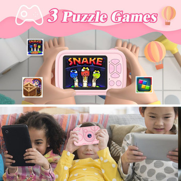 - Multiple Functions: This kids camera offers more functions based on original photo recording, video recording, playback, burst recording, self-timer, classic filters, cute cartoon frames. Each kids camera comes with a 32GB Micro SD card (already installed in the camera). It also has built-in puzzle games and can play music.