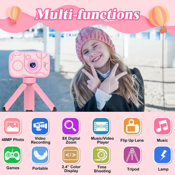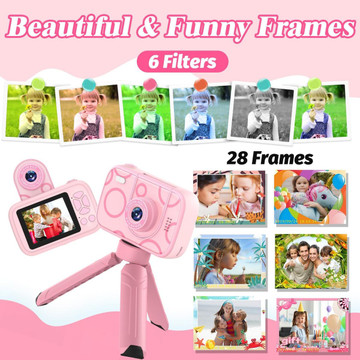 - Tripod/Selfie Stick is included: This kids camera is equipped with a tabletop tripod, it can also be used as a selfie stick, so that kids have a variety of ways to take photos and selfie. Create your own amazing videos on this kids video camera180° Flip Lens Design: This kids camera takes photos and selfies by rotating the camera up and down 180°, only manual operation is required to switch between selfies and photos.Multiple Functions: This kids camera offers more functions based on original photo recording, video recording, playback, burst recording, self-timer, classic filters, cute cartoon frames. Each kids camera comes with a 32GB Micro SD card (already installed in the camera). It also has built-in puzzle games and can play music.Built-in USB Rechargeable Powerful Battery: With built-in large capacity lithium battery, you can take photos continuously for 2-3 hours after fully charged (varies with usage and other factors).Great Gift Camera Toy for Kids: This cute kids camera is a great choice as a birthday gift, Christmas gift, New Year gift or holiday gift for your kids aged 3-12, as a mini video camera perfect digital for young children.