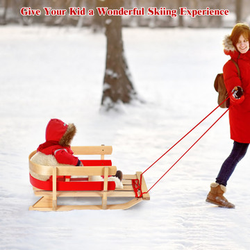 Relive winter adventures with the Kids' 54" Wooden Snow Sled! It's built tough with a double-knee structure and smooth metal runners for thrilling downhill rides. The steering bar lets you easily navigate your course, and you can haul it back up the hill using the pre-drilled holes for a pull rope. Beyond the slopes, its charming vintage design and red-painted metal adds a touch of classic style to any space. This sled is ready to go straight out of the box, offering winter fun and timeless decor. Grab yours now and rediscover the joy of sledding!