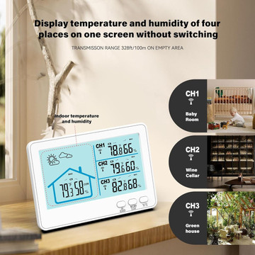 - Indoor and Outdoor Sensor: Remote sensor for both indoor and outdoor use; Maximum communication distance of 328.4 ft (100 m), effective distance of 98.4 ft (30 m). Automatically sends temperature and humidity measurements in 4 locations using the child sensor It is useful for managing your family's health, preventing the flu and colds, as well as keeping your skin moisturized by checking the room for dry, as a countermeasure against mold and heatstroke