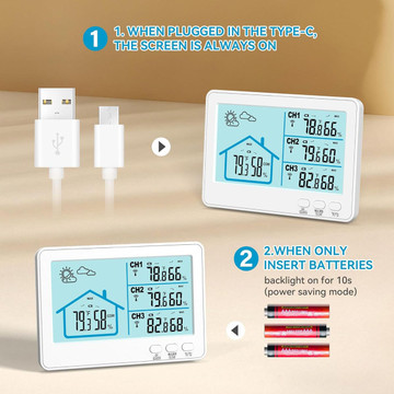 - Backlight & Alarm Function: The backlight function makes it convenient to set and read even in dim conditions. When the set highest/lowest temperature and humidity is exceeded, the product will ring an alarm and turn on the backlight. Limit Alarm (Orange Backlight), Lower Limit Alarm (Red Backlight)