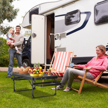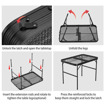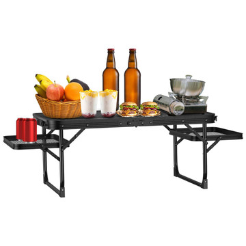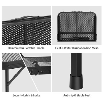 Elevate your outdoor adventures with our Foldable Camping Table! Its sturdy steel frame, heat-resistant aluminum top, and moisture-resistant MDF ensure durability in any weather. With its spacious top, side tables, and lower shelf, you'll have ample room for all your grilling essentials. Plus, built-in hooks and a paper towel holder keep your tools organized. Weighing just 17 lbs and folding flat for easy storage, it's the perfect companion for camping, picnics, or backyard barbecues. Experience the convenience and durability of our Foldable Camping Table, designed to make your outdoor gatherings more enjoyable than ever before.