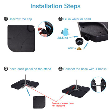 Enjoy your outdoor leisure time with the confidence of strong support! Our umbrella base stand is crafted from premium steel and powder-coated for weather-resistance and rustproofing. This ensures a long outdoor service life, as well as great solidity that won't let the umbrella tilt easily. With two adapters of different sizes, this stand fits various umbrellas with 1.6'' or 1.9'' umbrella poles. Additionally, you can tighten the knob to secure the pole in place for extra stability. It also comes with four adjustable footpads to keep it stable on uneven ground while protecting your floor from scratches. Installation is easy - just follow the clear instructions and all necessary components are included! This versatile umbrella base allows you to enjoy joyful outdoor time in the yard, balcony, terrace, poolside, cafe shop, and more. Get yours today and experience the difference!