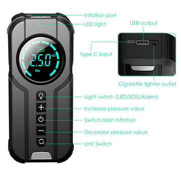- Insert the cigarette plug into the socket and connect the inflation nozzle to the tire. Finally set the pressure and switch it on to start inflating. It will automatically power off after reaching the set value.