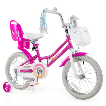 Ignite your child's passion for riding with the Kids' Bike with Doll Seat. This versatile bike is designed to grow with your child, featuring a high-carbon steel frame and adjustable saddle (22''-25'') and handlebar (30''-31''). Safety is a top priority, which is why this bike is equipped with dual brakes for added security. With a hand brake and coaster brake, your child can stop instantly with ease. The fully enclosed chain guard and multiple reflectors ensure maximum safety during every ride. The bike also comes with two training wheels that can be easily removed as your child gains confidence. The 14" or 16'' nylon rubber wheels and anti-slip pedals provide stability on various surfaces, including grass, cement floors, and boardwalks. Plus, the wheels are leak-proof, wear-proof, and puncture-proof, guaranteeing long-lasting durability. For added fun, the bike includes a detachable doll seat, perfect for taking along a favorite companion on exciting adventures.