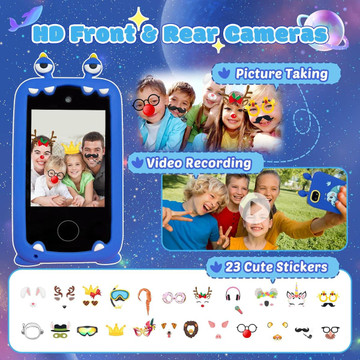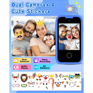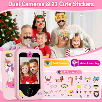 - Dual Camera:The phone toys for 4-6 year old girls boys is equipped with 8.0 Mega pixels and 1080P Video.Features Dual Camera,the kids camera can easily achieve dual front and rear shots.With pop photo stickers shooting, children can take some funny photos with family or friends.