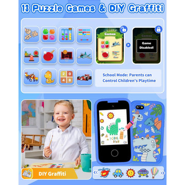 - Puzzle Game & Powerful Battery Life: The toy phone for 4-6 year old kids includes 13 puzzle games, which can effectively exercise children's logical thinking ability, problem-solving ability, brainstorming ability. reaction and hand-eye coordination. In addition, the anti-addiction mode allows parents to effectively control their children's daily game time. The DIY graffiti function allows children to give full play to their imagination. There is a silent mode, so there will be no noise to disturb you.
