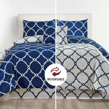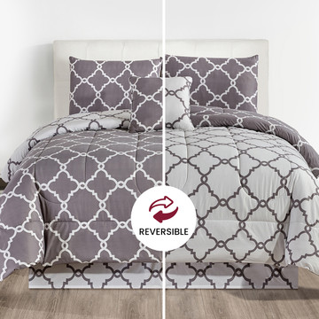 Transform your sleep space with the 5-Piece Reversible Microfiber Bed Comforter Set. This super soft and durable bedding upgrade offers two stylish looks in one versatile design. It's lightweight and breathable, making it perfect for year-round comfort. With matching pillow shams, a decorative pillow cover, and a bed skirt included, you'll get a coordinated and polished bedroom refresh. Upgrade your comfort game today; buy the set now!