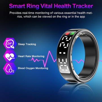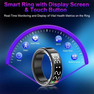 - 2025 New Version Smart Ring with Touch Display for Real-Time Health Data: This advanced smart ring features a sleek LED display screen and responsive touch button for easy access to real-time health data. Effortlessly monitor key metrics such as heart rate, blood oxygen, sleep duration, step count, time, and battery life-without needing to pull out your phone. Stay connected and track your health on the go with this compact and stylish fitness tracker ring.24/7 Health Monitoring Features: Stay on top of your well-being with this health ring that tracks vital health metrics. It monitors blood oxygen levels, heart rate, and sleep patterns, providing detailed insights into your sleep cycles-deep sleep, light sleep, and awake times. This smart ring helps you better understand your body, optimize rest, and maintain a healthy lifestyle with accurate, real-time data, all from a sleek, wearable device.Fitness Ring for Tracking Multiple Sports Activities: Elevate your fitness journey with this smart ring that offers built-in activity tracking for various sports. It supports multiple sports modes, including walking, running, hiking, cycling, and golf, allowing you to track your performance in each activity. Whether you're on the golf course or engaging in other activities, the ring provides real-time data to help you monitor your progress, set goals, and stay motivated in your fitness journey.Easy-to-Use Smart Ring with Gesture Control for TikTok & Photos: Effortlessly control your phone with intuitive gestures to browse TikTok, take photos, turn pages in e-books, and navigate through apps. The responsive sensors enable seamless interaction with your phone, making it ideal for capturing moments or enjoying social media hands-free. Perfect for on-the-go content creation and touch-free interaction!Lightweight & Compact Fitness Tracker with IP68 Waterproof Durability: Weighing only 3.5g, this smart ring is ultra-light and comfortable for all-day wear. It's also IP68 waterproof, making it perfect for swimming, running in the rain, or intense workouts without worrying about water damage. Whether you're in the pool or caught in a downpour, this durable ring ensures reliable performance, helping you track your health and fitness in any condition.Fast Bluetooth Connectivity & Free App: Effortlessly sync your smart ring with your smartphone via Bluetooth in seconds for seamless tracking and control. The accompanying app is completely free to download and use, with no hidden charges, ensuring you can easily monitor your health and fitness data without any additional cost. Enjoy a hassle-free setup and an intuitive experience right from the start!Long Battery Life & Convenient Charging Case: Enjoy 3-5 days of battery life with this smart ring, and easily charge it with the compact charging case that also serves as a protective storage box. Take it anywhere you go, whether at home or on the move, for ultimate convenience. This sleek and stylish fitness ring is an ideal gift for both men & women. Whether for a birthday, anniversary, or special occasion, it's a thoughtful and practical gift for those who value health and fitness tracking.