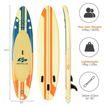 This fun "Summer" 10.5- or 11-Foot Inflatable Stand-up Paddle Board is ideal for water activities, such as water surfing, paddling, water yoga, fishing, and sunbathing. It can be inflated quickly with the hand pump and deflated with a valve wrench and includes a carrying bag so it's easy to store and transport. Three removable fins control surfing speeds and directions easily, and a widened board design helps you keep your balance and stay stable. If you are dreaming of a cool water experience this summer, this paddle board set is just the thing you need.