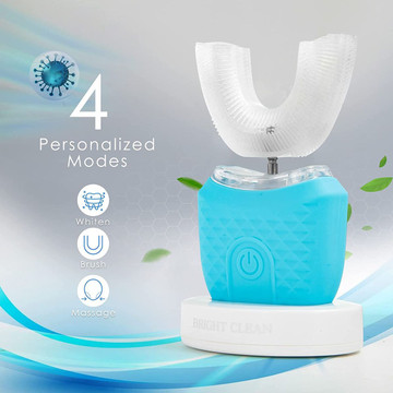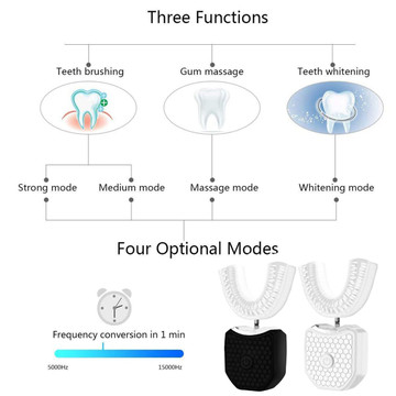 - CLEAN & FRESH YOUR MOUTH - U shaped design removes stains on your lower teeth near your gums. (Traditional toothbrush can't reach that part) Promote blood circulation of your gum by nice vibration massage. Gum health avoids bad breath.UPGRADE BRUSHING - Made of food-grade silicone, soft bristles prevent receding gum line. Various bristles remove stain effectively. Full coverage of your teeth does better in brushing.4 BRUSHING MODES - Gentle mode (massage); Powerful mode (comfortable); Cleansing mode (brush); Whitening mode (recommend to use with whitening gel but whitening gel is NOT included). 45 seconds smart timer helps brushing scientifically by auto off after 45 seconds.WATERPROOF & USB CHARGING - IPX7 waterproof automatic toothbrush can be used at bath and shower.HANDS FREE DESIGN - Improving the efficiency of your life, hands free design allow you to brush your teeth and handle other things at the same time.