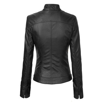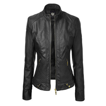 Elevate your wardrobe with our Women's Faux Leather Moto Jacket with Hoodie. This stylish jacket boasts a removable knit hood for versatility, along with intricate pintuck details on the shoulder, waist, and sleeve for a touch of sophistication. Its double snap collar and exposed front zipper add a touch of edge, while the fully lined interior ensures warmth and comfort. Order one size up for a roomier fit and enjoy the convenience of a removable hood that adapts to your style and the weather.