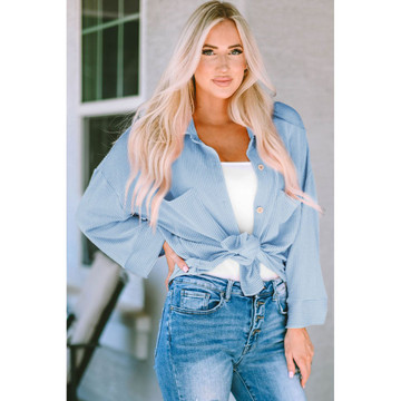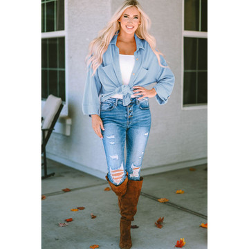 Women's Ribbed Roll-Tab Sleeve Chest Pocket Oversized Top